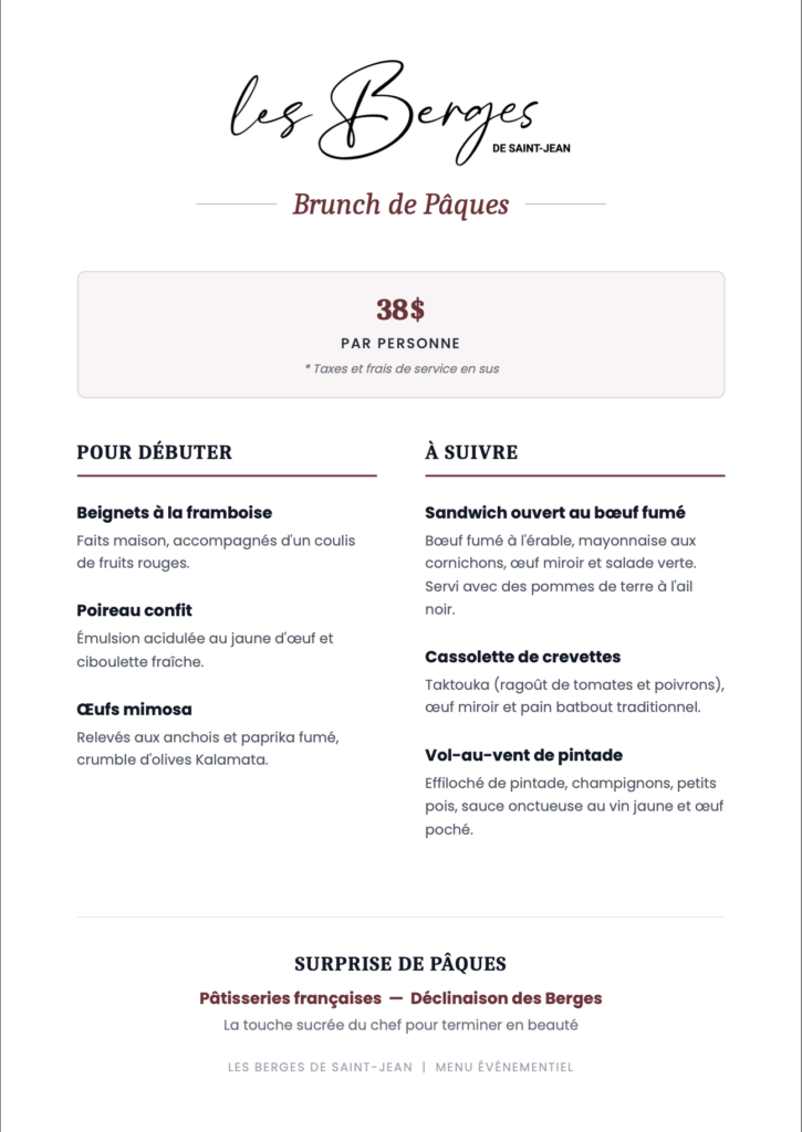 Venez célébrer Pâques en famille autour d’un brunch festif aux Berges ! Notre chef a concocté un menu gourmand qui ravira petits et grands, dans une ambiance chaleureuse et conviviale.